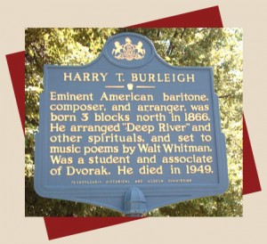 Marker Text: Eminent American baritone, composer, and arranger, was born 3 blocks north in 1866. He arranged “Deep River” and other spirituals, and set to music poems by Walt Whitman. Was a student and associate of Dvorak. He died in 1949.