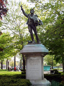 Oliver Hazard Perry is best known for his command of the U.S. naval fleet built along the shore of Erie County, PA and the defeat of the British off Put-In-Bay, OH in the Battle of Lake Erie September 10, 1813. This statue, which is made of bronze and limestone and stands twenty-two feet, was constructed by Captain William Green Turner. Turner’s presentation is of the young man the moment he stepped aboard the Niagara after leaving his heavily damaged Lawrence – right arm raised and the battle flag slung over his left shoulder. Perry spent most of his years at sea following the Battle of LakeErie, dying of yellow fever at the age of 34. Dedicated August 23, 1985 in recognition of Perry’s 200th birthday, the statue is an exact replica of the original which stands in his hometown of Newport, Rhode Island.