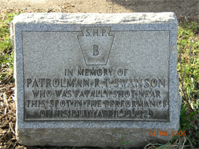The men were placed under arrest and told to drive to Justice Pease’s office in town. Swanson would follow behind on his motorcycle. Just after getting into town, however, the rear window opened and one of the men shot the patrolman. The bullet entered Swanson’s skull under his left eye and went into his brain. Swanson died at Dr. E.G. Shelley’s office on Main Street within fifteen minutes of being shot.